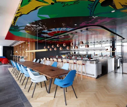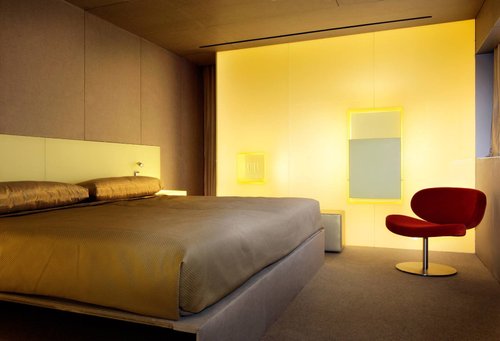 The design of this distinctive floor of hotel rooms and suites blends a series of neutral materials such as grey granite, felt and cement board set against a more luxurious pallet of silk curtains, glass and luminous colored acrylic – blue for the North facing rooms and yellow for the South facing rooms. This design was part of a unique project included some of the worlds foremost architects, the façade was design by Jean Nouvel, the lobby by John Pawson, The bar by Mark Newsom, Restaurant by Chritian Liaigre and other floors by Norman Foster, Zaha Hadid and Arata Isozaki among others.